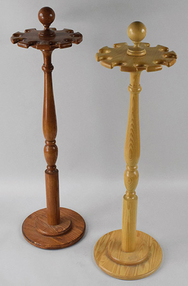 Description:Lot of (6) professionally made wooden floor standing bat racks (EX/MT-NM) Grouping of nice wooden floor standing racks (41"-42" tall), each with space for (10) bats. Well cared for over time with a touch of light scattered wear mentioned largely for accuracy (polish/buffing would likely reverse these issues). Four done in a natural or blond color, (2) darker: EX/MT-NM ($500-$1,000)