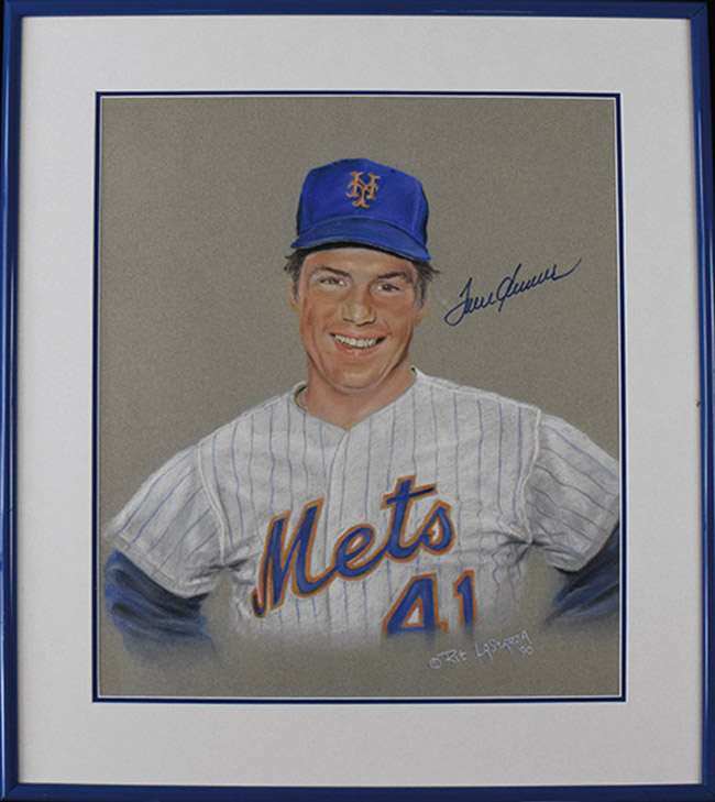 Description:Tom Seaver signed original pastel drawing also signed by artist Rit LaStarza (NM). 4.5"x27" framed original pastel drawing signed by Seaver in blue marker. Signature rates 9/10 out of 10. Also signed by artist Rit LaStarza and dated 1990: NM appearance