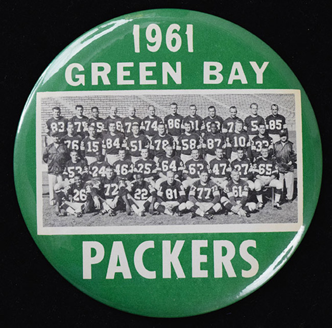 Description:High grade oversized 1961 Green Bay Packers team photo pin, NFL champions (NM). 6" 1961 Packers team photo pin with ASCO Inc. maker tag still intact on the back. Displays only very minor wear, with a small area of surface loss on the paper back: NM