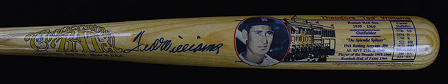 Description:Ted Williams signed Cooperstown Bat Co. "Famous Player Series" bat (NM) Commemorative bat having printed on image, titling, and text has been signed "Ted Williams" in marker rating 8 out of 10: NM ($400-$600)