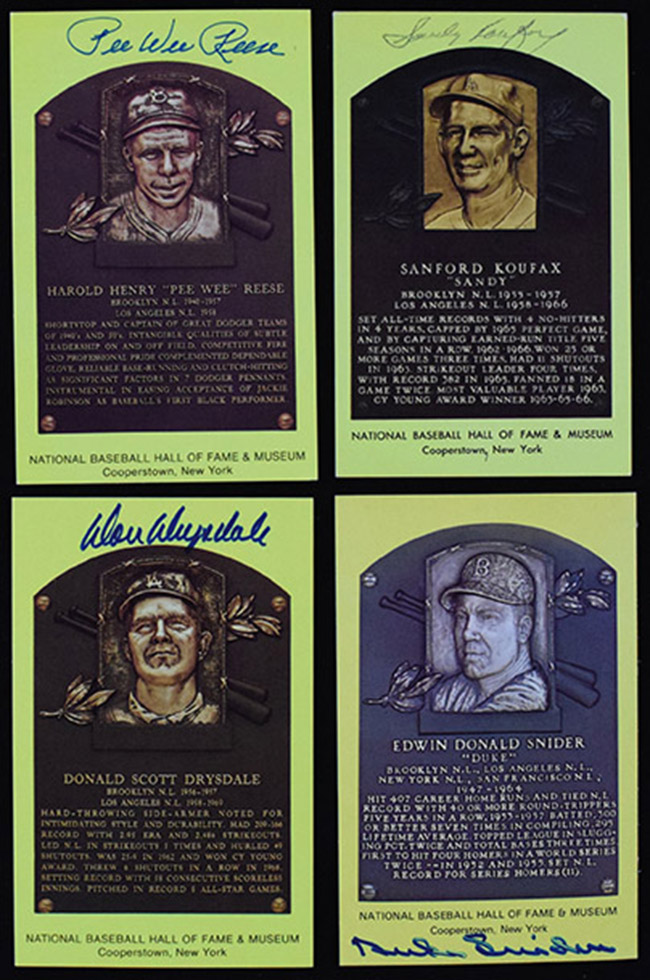 Description:Lot of (5) Dodgers signed HOF plaque postcards (EX/MT-NM). Incl. Don Drysdale, Pee Wee Reese, Duke Snider, Sandy Koufax, and Walter Alston. Signatures rate 7/8 (Koufax) to 10 (avg 8/9) out of 10: EX/MT-NM