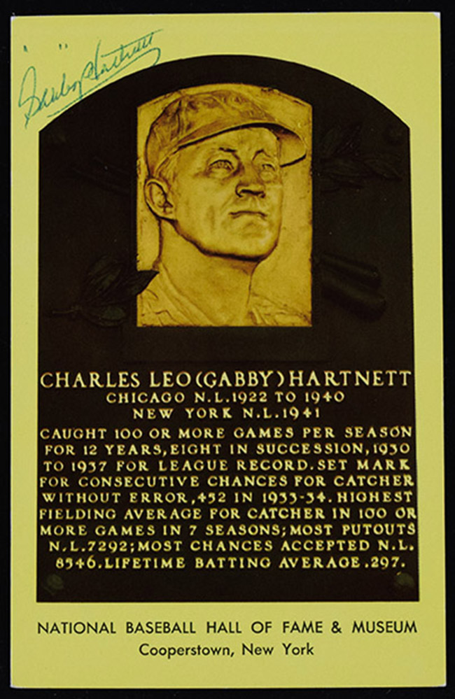 Description:Gabby Hartnett signed HOF plaque postcard (NM). Hartnett signed the front in blue ink. Signature rates 8 out of 10. Just a hint of minor corner wear: NM