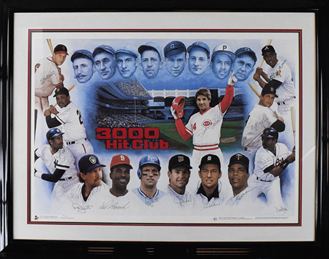 Description:3,000 Hit Club signed limited edition print - (13) autographs incl. (12) Hall of Famers (EX/MT) Large format print has been signed by Musial, Mays, Winfield, Yount, Brock, Brett, Molitor, Kaline, Carew, Murray, Yastrzemski, Rose, and Aaron. Marker signatures rate 7-7/8 out of 10. Hand numbered "40/285" and framed for display to 36.5"x47.5" overall: EX/MT ($500-$750)