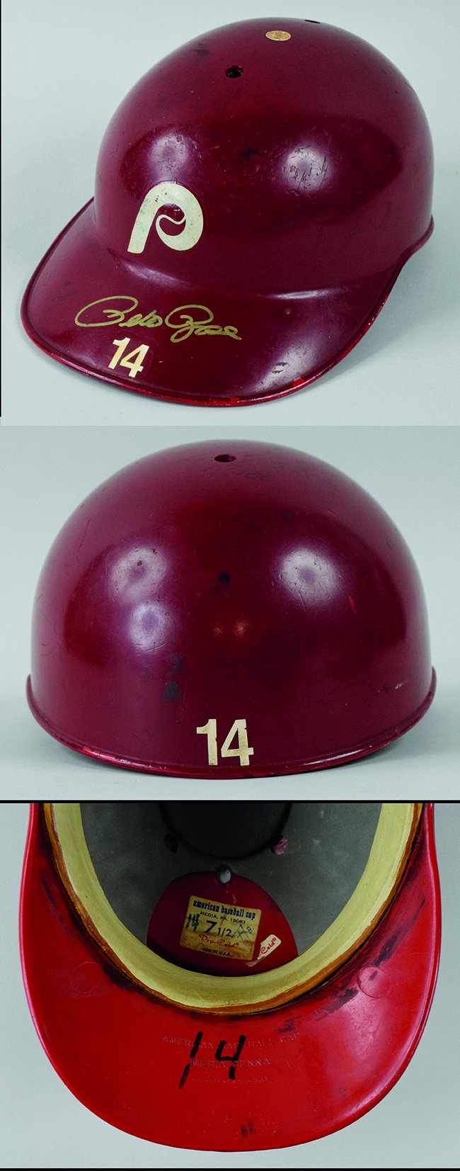 Description:Pete Rose signed Philadelphia Phillies professional model batting helmet c.1980s (EX) Exceptional piece of game equipment from one of the premier players of the modern era has been style matched to many images of Rose taken during his time with the Phillies. Maroon batting helmet with "P" team logo has a white simulated button accent on top and player number "14" in white block letter on brim and back. In addition, "14" is written under the brim in vintage black marker. "American Baseball Cap" tag inside notes size (7 1/2) and has vintage ink "14" and "Fla." notations. Strong usage wear evident throughout and all interior padding remains in place. Signed on the brim in gold marker, "Pete Rose" rating 8 out of 10: EX ($1,000-$3,000)