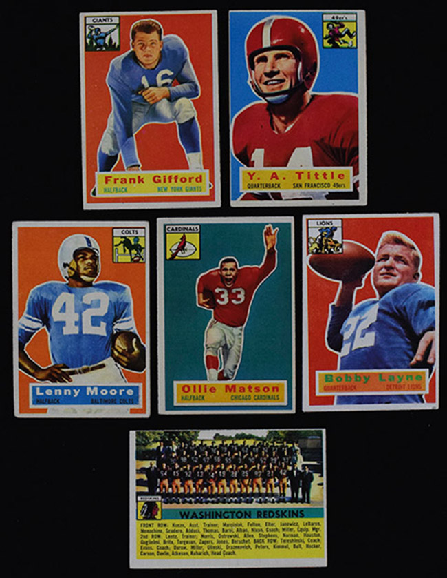Description:1956 Topps football near complete set (119 of 120 cards) (Range GD-EX/MT, Avg. VG-EX) Missing #63 Steelers Team. Keys grade as follows: #6 Van Brocklin (VG OC), 11 Blanda (VG-VG/EX), 13 Janowicz (VG-VG/EX OC), 22 Cardinals (VG/EX-EX OC), 28 Bednarik (VG OC), 49 LeBaron (GD/VG-VG), 53 Gifford (VG/EX-EX), 58 Matson (EX-EX/MT appearance with minute spec adhered to one back corner), 60 Moore (VG/EX-EX with very small stain at left edge), 61 Redskins (EX OC), 86 Tittle (EX OC), 116 Layne (EX-EX/MT with minute stain at lower edge): Range GD-EX/MT, Avg. VG-EX ($400-$600)