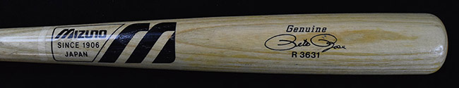 Description:Pete Rose professional model baseball bat c.1980s (EX/MT) Mizuno model "R3631" baseball bat with Rose facsimile signature printed on barrel has a "A" stamped in the knob (denoting Ash wood type). A touch of light/mild surface wear can be found throughout along with what appear to be some rack streaks (little mentionable use). Fine example for display dating the era in which he set his long standing hit record: EX/MT ($400-$600)