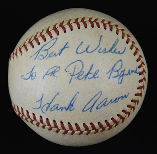 Description:Hank Aaron vintage signed C.Feeney NL baseball (EX/MT). Signed on the side panel by Hank Aaron in blue ink (personalized). Signature rates 9 out of 10. Minor toning, with slightly faded stampings: EX/MT