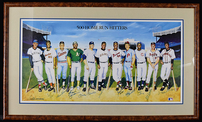 Description:500 Homerun Club signed poster/print - tastefully framed for display (NM) Popular oversized poster has been signed by all (11) pictured incl. Mantle, Williams, Aaron, Mays, Jackson, Robinson, McCovey, Mathews, Banks, Schimdt, and Killebrew. Marker signatures rate 8 to 9 out of 10. Double matted and framed for display to measure 26.5"x44.5" overall: NM ($750-$1,000)