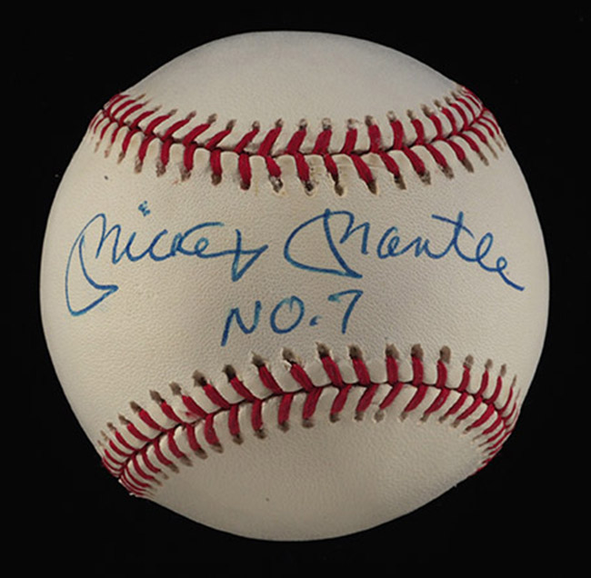 Description:Mickey Mantle single signed baseball with "NO.7" inscription (JSA) (NM) Rawlings B.Brown Official American League baseball has been signed on the sweetspot in ink rating 8 out of 10. JSA Authentication label affixed, COA is not included: NM ($500-$750)