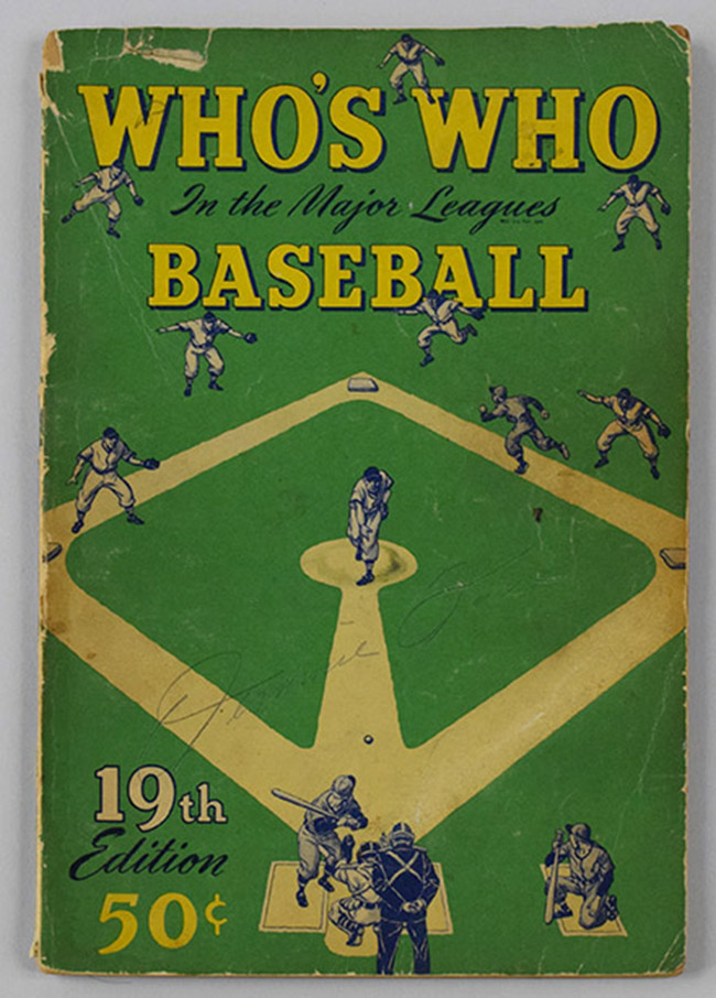 Description:Jimmie Foxx signed 1951 Who's Who In Baseball (Sig. EX, Book GD) Soft cover edition of the 1951 guidebook has been signed on the cover in pencil rating 7-7/8 out of 10. Book itself has wear including chipping/loss to cover at edges and corners, some small tears, and mild soiling. Some interior page similarly effected: Sig. NM, Book GD ($300-$500)