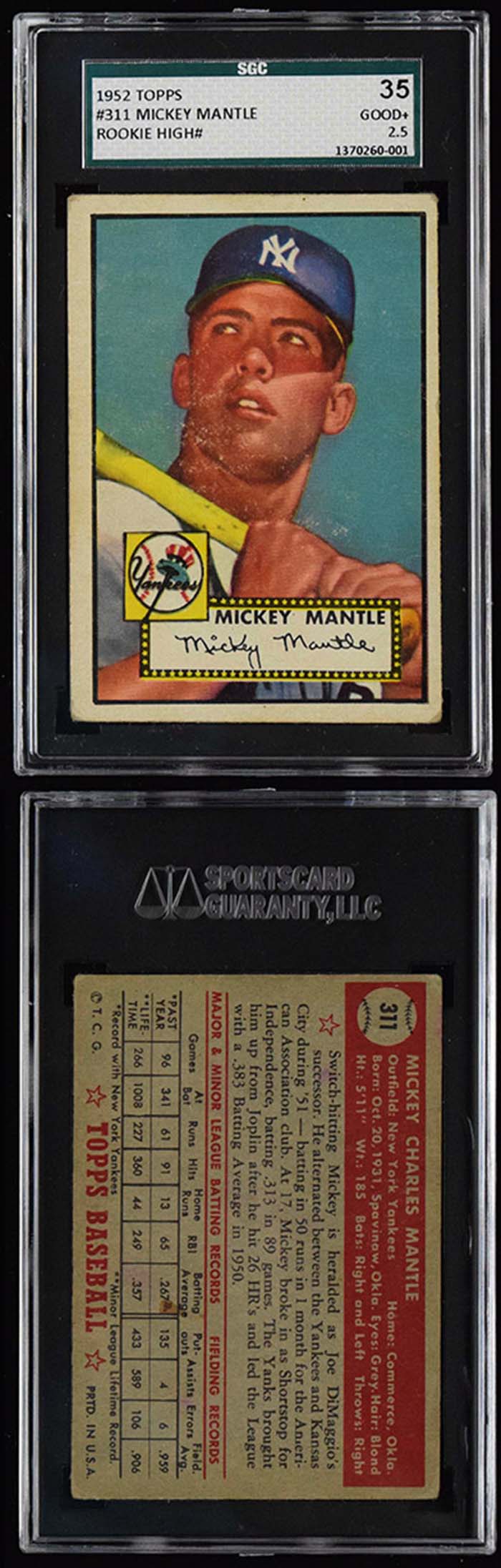 Description:1952 Topps #311 Mickey Mantle Rookie (SGC 35 Good+) Nice example with vibrant and well colored image centered toward right border. Touch of expected corner/edge wear with a horizontal crease just above Mantle's name which accounts for technical grade: SGC 35 Good+ ($10,000-$15,000)