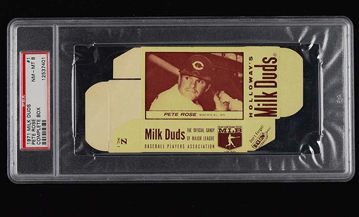 1971 Milk Duds #1 Pete Rose complete box graded PSA 8 (NM/MT).