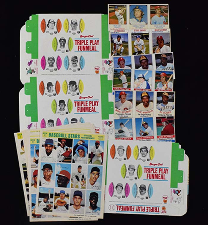 Description:Lot of uncut 1969 MLB Photostamps, 1977 Burger Chef discs set, and various Hostess panels (NM-NM/MT overall). Incl. 1969 MLB Photostamps complete set of (18) uncut sheets; (12) uncut 3-card Hostess panels from 1975-1979 with cards including (5) Mike Schmidt, Willie Stargell, (4) Steve Carlton, (3) Pete Rose, Carlton Fisk, (3) Dave Winfield, Tom Seaver, Rod Carew, and others; and 1977 Burger Chef Funmeal complete set of (24) trays with all discs still intact: NM-NM/MT overall