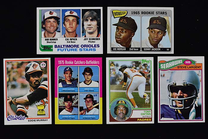 Description:Lot of (14) Baseball, Basketball, and Football HOFers rookie cards from 1965-1989 (EX/MT-NM/MT). Baseball includes 1965 Topps #16 Joe Morgan rookie (NM); 1975 Topps #620 Gary Carter rookie (NM); 1978 Topps #s 36 Eddie Murray (NM), and 707 Molitor/Trammell (NM oc); 1982 Topps #21 Cal Ripken rookie (NM); 1983 Donruss #598 Tony Gwynn (NM-NM/MT); 1983 Fleer #360 Gwynn (NM/MT); 1983 O-Pee-Chee #143 Gwynn (NM); and 1983 Topps #482 Gwynn (NM). Football includes 1977 Topps #177 Steve Largent (NM); 1979 Topps #310 James Lofton (EX/MT-NM); 1981 Topps #194 Art Monk (EX/MT-NM); and 1986 Topps #389 Bruce Smith (NM). Also includes 1989-90 NBA Hoops #138 David Robinson rookie (NM/MT). Range: EX/MT-NM/MT