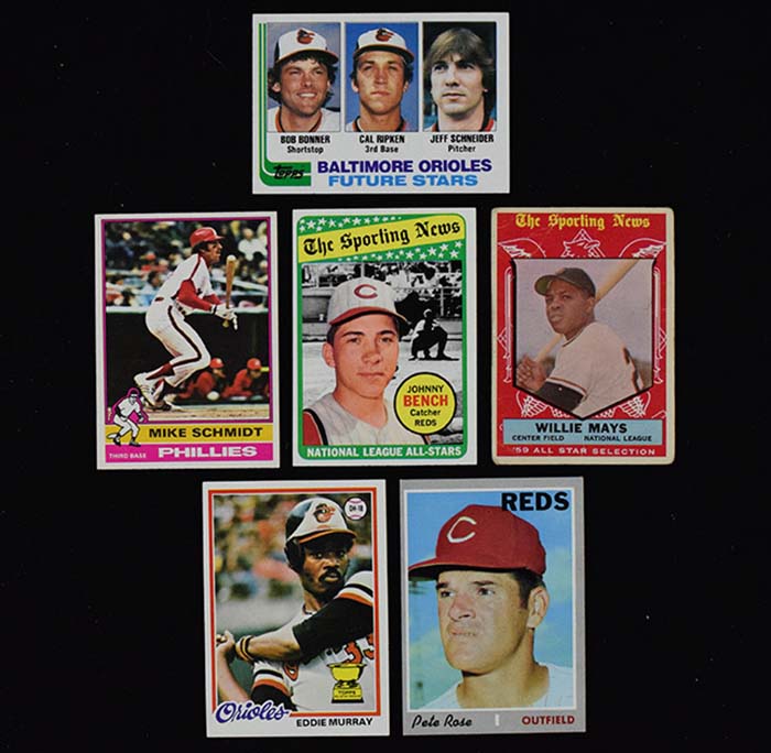 Lot of (27) stars & HOFers baseball cards from 1959-1983 including rookies (GD-NM/MT). Incl. 1959 Topps #563 Willie Mays (GD); 1965 Topps #460 Richie Allen (PSA 6 EX/MT); 1969 Topps #s 428 Lou Brock (VG/EX), 430 Johnny Bench (EX/MT), and 432 Bob Gibson (EX oc); 1970 Topps #580 Pete Rose (VG/EX); 1975 Topps Mini #70 Mike Schmidt (NM); 1976 O-Pee-Chee #480 Schmidt (NM); 1977 OPC #240 Rose (NM); (2) 1978 Topps #36 Eddie Murray rookies (NM-NM/MT); 1979 OPC #343 Rose (EX/MT, stain); (4) 1982 Topps #21 Cal Ripken rookies (NM-NM/MT); (4) 1983 Donruss #598 Tony Gwynn rookies (NM-NM/MT); 1983 Fleer #360 Gwynn (NM); and (6) 1983 Topps #482 Gwynn rookies (NM-NM/MT). Range: GD-NM/MT