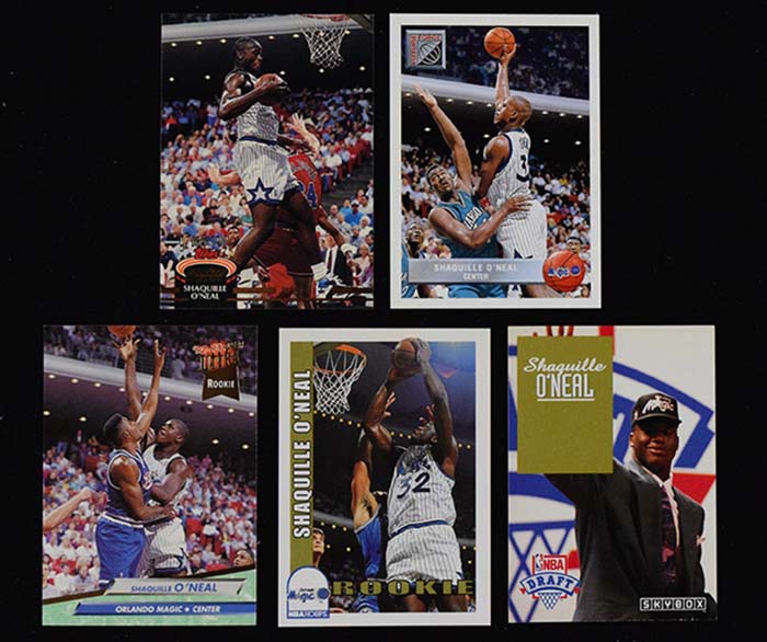 Lot of (56) Shaquille O'Neal rookies cards (NM/MT overall). Incl. (12) 1992-93 Fleer Ultra #328 O'Neal; 1992-93 Fleer Ultra "Rejectors" #4 O'Neal; 1992-93 NBA Hoops #442 O'Neal; 1992-93 NBA Hoops "Draft Redemption" #A O'Neal; 1992-93 NBA Hoops "Magic's All-Rookie Team" #1 O'Neal; (3) 1992-93 Skybox "Draft Picks" #DP1 O'Neal; (36) 1992-93 Topps Stadium Club #247 O'Neal; and 1992-93 Upper Deck McDonald's "Orlando Magic" #OR5 O'Neal: NM/MT overall