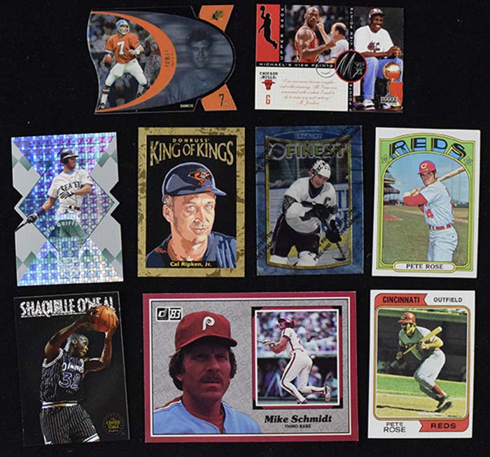 Description:MUCH better than normal balance of card collection lot with very nice breakdown value (NM-NM/MT overall). Large pallet lot of mostly baseball, followed by basketball, and then about the same amount of football and hockey. Years range from the 1960s through the 1990s, with most being from the 1980s-90s. Mix of sets, partial sets, food issues, oddball cards and individual cards with virtually all of the stars from the 1980s-90s represented including countless rookies. Absolutely loaded with baseball and basketball promo cards and insert cards from the 1990s (includes numerous complete sets of insert cards). Players include Michael Jordan, Mike Schmidt, Troy Aikman, Nolan Ryan, Rickey Henderson, George Brett, Pete Rose, Shaquille O'Neal, Ken Griffey Jr, Cal Ripken Jr, David Robinson, and many other stars and HOFers. Also includes various minor league baseball team sets, college basketball team sets, and countless Philadelphia Phillies team issue photo card sets from the 1980s. Potential for incredible breakdown value, and previewing the lot is highliy recommended since the size makes if difficult to describe all that is worthy of mentioning: NM-NM/MT overall
