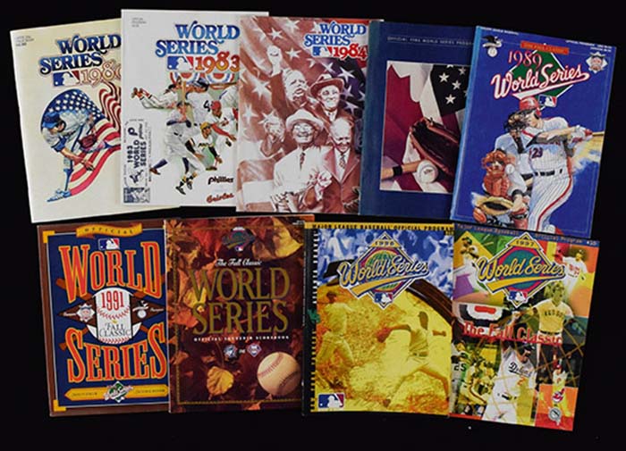 Description:Lot of (38) World Series programs from 1980-1997 (NM overall). Incl. 1980, (11) 1983 all date stamped with on-site Babe Ruth 20-cent cancellation stamp (includes Game 3 and Game 4 ticket stubs), 1984, (4) 1986, (5) 1989, 1991, (2) 1993, (8) 1996, and (5) 1997: NM overall