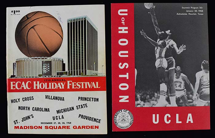 Description:1968 UCLA vs. Houston "Game of the Century" program, plus 1968 Holiday Festival program with Alcindor (VG/EX-NM). Includes program from historic game between Houston and UCLA played on January 20th 1968 at the Astrodome. It was called the "Game of the Century", and was the first NCAA regular season game broadcast nationwide in prime time. Elvin Hayes scored 39 points to lead Houston to a 71-69 win over Lew Alcindor and UCLA, but it was UCLA's only loss of the season, and they went on to win the NCAA championship. Program remains in NM condition with minimal handling wear, and is scored in ink on the scorecard page. Also includes December 27-30th Madison Square Garden ECAC Holiday Festival program with the following teams participating: Villanova, Holy Cross, Princeton, North Carolina, Michigan St, St.John's, UCLA, Providence (VG/EX due to ink marks on cover).