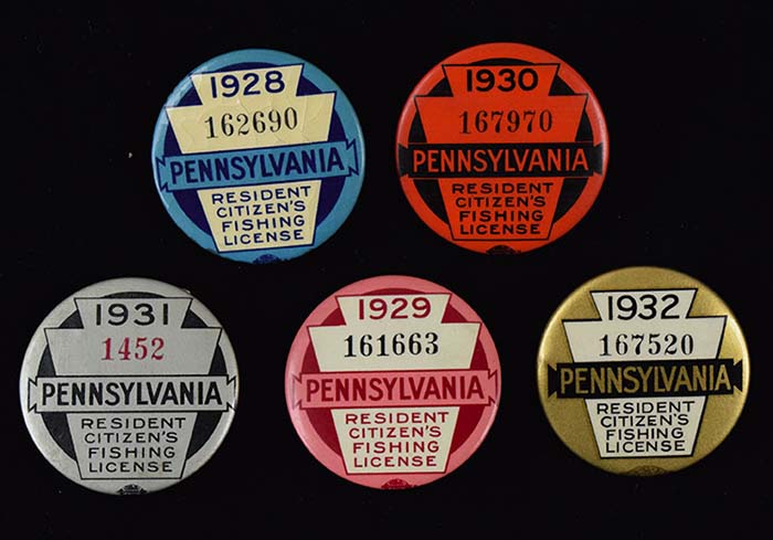 Description:1928-1932 Pennsylvania Resident fishing license pins (5) (EX-EX/MT with 1 lesser) Nice examples with some light toning and a hint of wear to front, backs have some mild rust. The 1931 has original paper insert in back. The 1928 has more pronounced wear and cracks to front: EX-EX/MT with (1) lesser