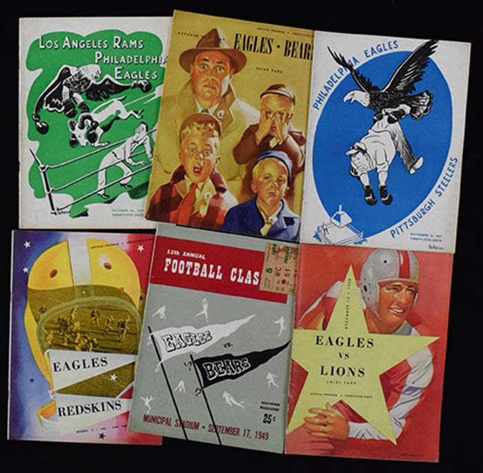 Description:Lot of (8) Philadelphia Eagles programs from 1947-1949 including (2) with ticket stubs (VG/EX-NM). Incl. Oct 26th 1947 Los Angeles Rams at Eagles (VG/EX, writing on back cover); Nov 30th 1947 Pittsburgh Steelers at Eagles (EX); Oct 24th 1948 Chicago Bears at Eagles (EX-EX/MT); Nov 21st 1948 Washington Redskins at Eagles (EX/MT, Steve Van Buren 171-yards rushing and a TD); Dec 12th 1948 Detroit Lions at Eagles (EX/MT-NM, Bill Dudley 2-TDs); Sept 17th 1949 Bears at Eagles pre-season program with ticket stub stapled to the cover (EX-EX/MT); Oct 8th 1949 Chicago Cardinals at Eagles (EX, Van Buren 2-TDs); and Oct 23rd 1949 Redskins at Eagles with ticket stub stapled to the cover (EX/MT-NM). Range: VG/EX-NM