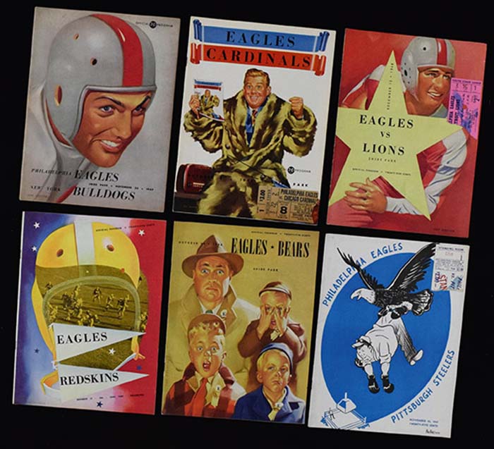 Description:Lot of (6) Philadelphia Eagles programs from 1947-1949 including (3) with ticket stubs (EX-NM). Incl. Nov 30th 1947 Pittsburgh Steelers at Eagles with ticket stub stapled to the cover (EX-EX/MT); Oct 24th 1948 Chicago Bears at Eagles (EX/MT); Nov 21st 1948 Washington Redskins at Eagles (EX/MT-NM, Steve Van Buren 171-yards rushing and a TD); Dec 12th 1948 Detroit Lions at Eagles with ticket stub stapled to the cover (EX/MT-NM, Bill Dudley 2-TDs); Oct 8th 1949 Chicago Cardinals at Eagles with ticket stub stapled to the cover (EX/MT-NM, Van Buren 2-TDs); and Nov 20th 1949 New York Bulldogs at Eagles (EX/MT, Van Buren 174-yards rushing and 2-TDs). Range: EX-NM