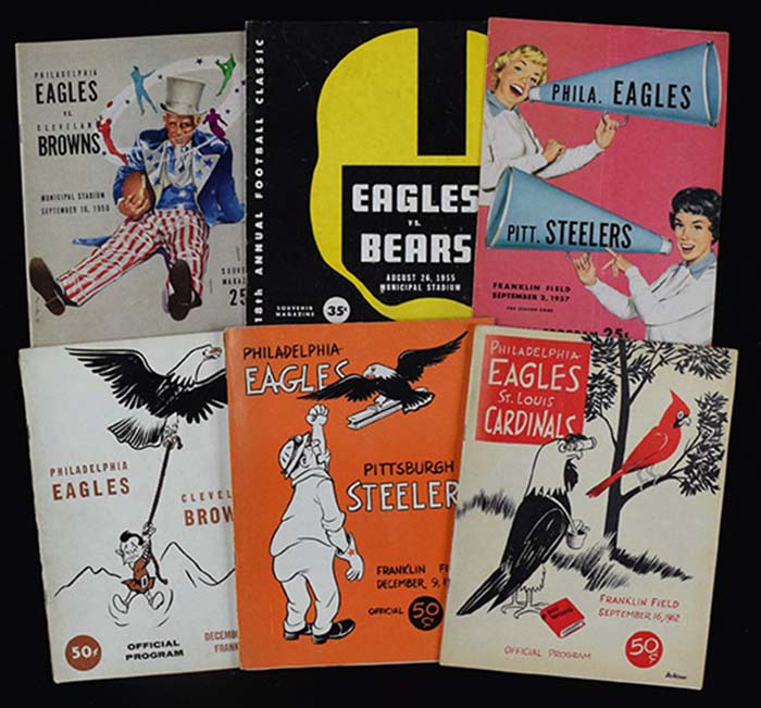 Description:Lot of (9) Philadelphia Eagles programs from 1950-1967 including (2) with ticket stubs (VG-NM). Incl. Sept 16th 1950 Cleveland Browns at Eagles with ticket stub stapled inside the front cover (EX/MT-NM, Otto Graham 346-yards passing and 4-TDs); Aug 26th 1955 Chicago Bears at Eagles pre-season game (EX); Sept 2nd 1957 Pittsburgh Steelers at Eagles pre-season game (VG/EX-EX); Dec 13th 1959 Browns at Eagles (VG, Jim Brown 152-yards rushing and 2-TDs, Bobby Mitchell 127-yards rushing and a TD); Sept 16th 1962 St. Louis Cardinals at Eagles with ticket stub (program EX, ticket stub EX-EX/MT); Dec 9th 1962 Steelers at Eagles (VG/EX-EX, Sonny Jurgensen 2-TD passes, John Henry Johnson 128-total yards and a TD); Oct 6th 1963 Dallas Cowboys at Eagles (EX); Nov 24th 1963 Washington Redskins at Eagles (EX-EX/MT); and Aug 5th 1967 Eagles vs Browns HOF Game (EX/MT-NM). Range: VG-NM