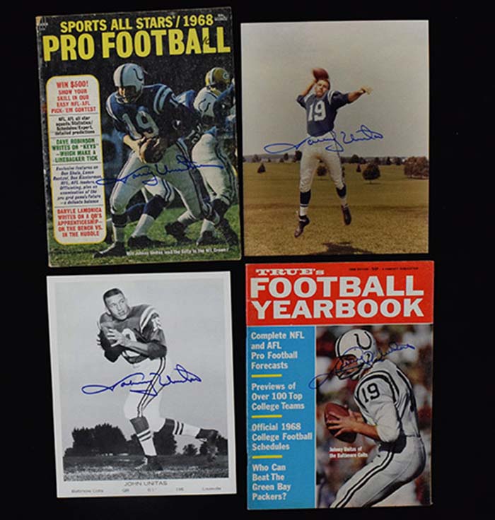 Description:Lot of (2) Johnny Unitas signed vintage publications and (2) signed photographs (VG/EX-NM). Incl. 1968 True's Football Yearbook signed by Johnny Unitas (EX/MT, Unitas is pictured on the cover); Sports All Stars 1968 Pro Football signed by Johnny Unitas (VG/EX, Unitas is pictured on the cover); and (2) different 8"x10" photos both signed by Unitas. Signatures rate 8/9 to 10 out of 10: VG/EX-NM