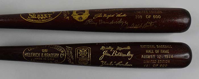 Description:1974 & 1987 (multi-signed) Baseball Hall of Fame Induction limited edition Louisville Slugger bats (NM-NM/MT). Incl. 1974 bat commemorating the inductions of Mickey Mantle, Sam Thompson, Jim Bottomley, Whitey Ford, Cool Papa Bell, and Jocko Conlan (#ed 481 of 500); and 1987 bat commemorating the inductions of Jim "Catfish" Hunter, Ray Dandridge, and Billy Williams and signed by all three in gold marker rating 7 (Dandridge smudge) to 8/9 out of 10 (#ed 209 of 500): NM-NM/MT