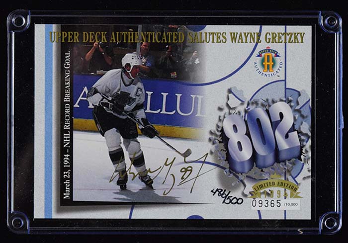 Description:Wayne Gretzky signed limited edition commemorative oversized hockey card, UDA (NM). 3.5"x5" 1994 Upper Deck card signed by Gretzky in gold paint pen. Signature rates 9 out of 10. Comes with COA from UDA (serial #ed hologram sticker is affixed). Card is #ed 486/5000: NM