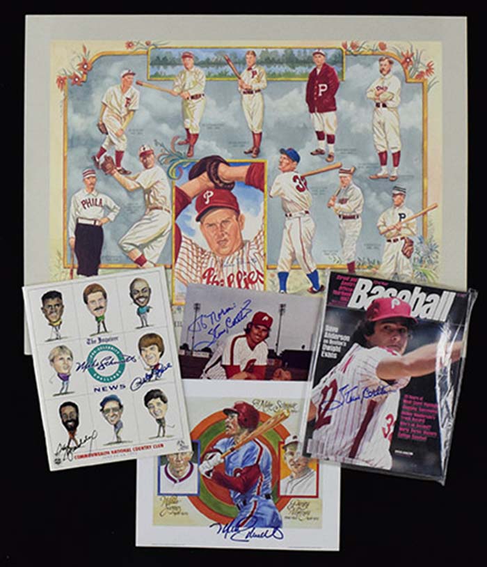 Description:Philadelphia Phillies autograph lot with Ashburn, Roberts, Schmidt, Carlton (NM overall). Incl. "Phillies In The Baseball Hall Of Fame" lithograph signed by Robin Roberts (#ed 624/850, also signed by artist Dick Perez); 11"x17" 1995 Dick Perez print signed by Richie Ashburn; Uncut sheet of 1988 Topps Campbell's Soup baseball cards signed by Richie Ashburn; 1983 Street & Smith's Baseball Yearbook signed by Steve Carlton; 8"x10" photo signed by Steve Carlton (personalized to Norm); (4) signed 1983 Phillies 10"x12" Perez-Steele prints including Mike Schmidt, Johnny Callison, Robin Roberts / Steve Carlton dual-signed, and Pete Rose / Dick Allen dual-signed; and 1993 Mike Schmidt Pro-Celebrity Challenge golf program dual-signed by Pete Rose and Garry Maddox. Signatures rate 8 to 10 out of 10: NM overall