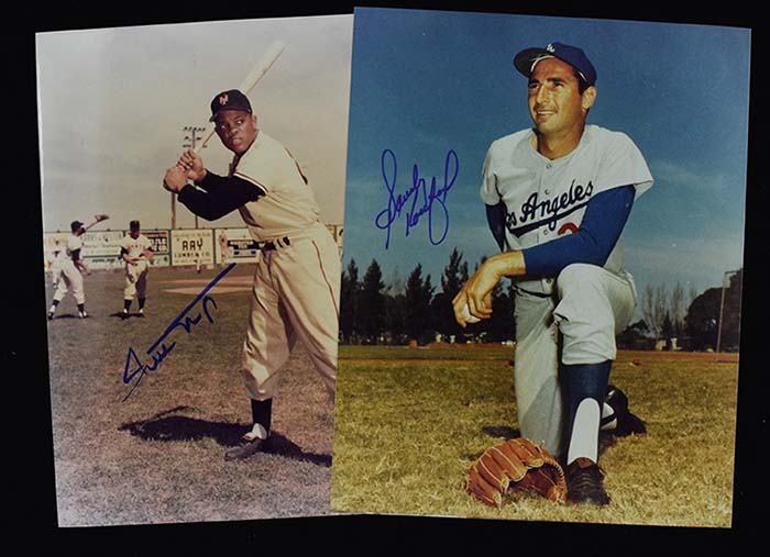 Description:Willie Mays and Sandy Koufax signed 8"x10" photographs (NM-NM/MT). Both signed their photo in blue marker. Signatures rate 9 to 10 out of 10: NM-NM/MT