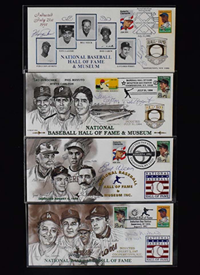 Description:Lot of (10) signed Baseball HOF commemorative FDC cachets (NM-NM/MT). Incl. 1991 dual-signed by Gaylord Perry and Fergie Jenkins; (2) 1994 both dual-signed by Phil Rizzuto and Steve Carlton; 1995 signed by Richie Ashburn; (2) 1996 both signed by Earl Weaver; (3) 1997 each signed by Phil Niekro with "318 W's" inscription added to two; and 1998 dual-signed by Larry Doby and Don Sutton. Signatures rate 8/9 to 10 out of 10: NM-NM/MT