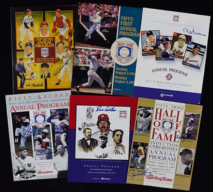 Description:Lot of (10) signed Baseball HOF Induction programs from 1989-1997 (NM-NM/MT). Incl. 1989 multi-signed by Carl Yastrzemski, Johnny Bench, Red Schoendienst, and Al Barlick; (3) 1990 each signed by Jim Palmer; (2) 1991 multi-signed by Gaylord Perry, Rod Carew, and Fergie Jenkins; 1991 dual-signed by Gaylord Perry and Rod Carew; 1992 multi-signed by Hal Newhouser, Tom Seaver, and Rollie Fingers; 1995 signed by Richie Ashburn; and 1997 signed by Phil Niekro. Signatures rate 8/9 to 10 out of 10: NM-NM/MT