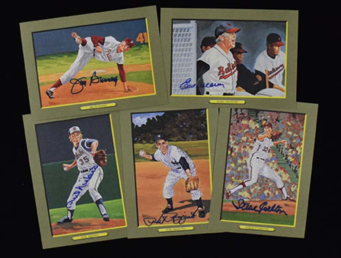 Description:1997 Perez-Steele Great Moments 9th series set with (5) signed including Rizzuto (NM-NM/MT). Signed cards include Phil Rizzuto, Jim Bunning, Steve Carlton, Phil Niekro, and Earl Weaver. Signatures rate 8/9 to 10 out of 10. Also includes the other (7) unsigned cards, and the original box: NM-NM/MT
