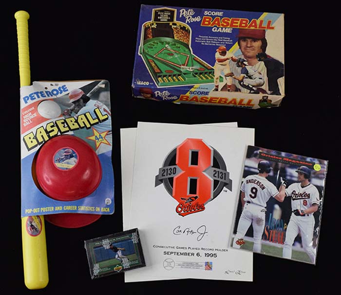 Description:Lot of Pete Rose and Cal Ripken Jr. memorabilia (EX/MT-MT). Incl. 1978 Pete Rose endorsed wiffle ball, bat, and helmet set still in original packaging (EX/MT); c.1979 Pete Rose "Score Baseball Game" with original box (EX/MT overall); (3) Sept 6th 1995 Baltimore Orioles programs (broke Lou Gehrig's consecutive games played record); (2) 1995 fold-open Cal Ripken Jr commemorative display pieces; (6) 1995 Cal Ripken Jr unopened commemorative Coke bottles; (6) Cal Ripken Jr commemorative publications; (6) 1995 Cal Ripken Jr pins; Factory sealed set of (22) 1996 Upper Deck "Cal Ripken Jr. Collection" over-sized baseball cards; and (2) 2001 Cal Ripken Jr unopened commemorative Coke bottles: EX/MT-MT