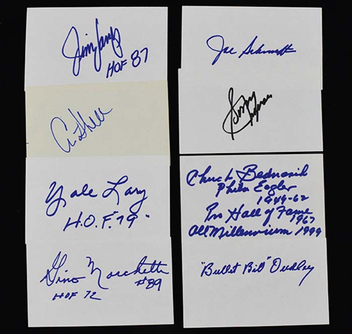 Description:Lot of (16) Football HOFers signed 3"x5" index cards (NM overall). Incl. Chuck Bednarik with "Phila Eagles 1949-62" "Pro Hall of Fame 1967" "All Millennium 1999" inscriptions, Gino Marchetti with "#89" "HOF 72" inscriptions, Bullet Bill Dudley, Jim Ringo with "HOF 81" inscription, Tom Mack with "LA Rams" "HOF 99" inscriptions, Jim Langer with "HOF 87" inscription, Art Shell, Stan Jones with "HOF 91" inscription, Yale Lary with "HOF 79" inscription, Joe Schmidt, Sonny Jurgensen, Charley Trippi, Ernie Stautner with "HOF 69" inscription, Larry Little with "HOF 93" inscription, Raymond Berry, and Tex Schramm with "HOF 91" inscription. Signatures rate 7/8 to 10 (avg 8/9) out of 10: NM overall