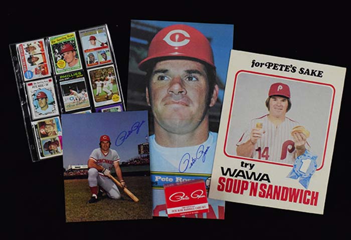 Description:Lot of Pete Rose memorabilia, baseball cards, and autographs (VG-MT). Incl. 1972 Topps Poster #11 signed by Rose; 8"x10" photo signed by Rose; (5) Topps 3-D advertising sheets with Rose; (3) 1981 Topps Squirt panels each with Rose; 1981 Delaware Valley Sports Collectors Show Baseball Card of the Year Award dinner program signed by Rose; 1971 Cincinnati Reds DELL STAMPS book and stamps (uncut); (5) 1985 Cincinnati Reds programs with Rose cover; 1978 Reds yearbook; 1985 Reds yearbook; Approx. (50+) Pete Rose baseball cards from the late 1960s through the 1980s; Copy of the 1989 Dowd Report; Pete Rose 1979 Canada Dry can; (4) 1982 Pete Rose 7-Eleven Cups; c.1980 Pete Rose WAWA store display and other store display signs; and many other Rose items. Various conditions throughout the lot, but most pieces appear NM overall. Range: VG-MT
