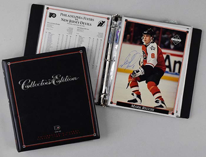 Description:Lot of (3) 1992-93 Philadelphia Flyers collector's edition photo sets by Upper Deck with (72) photos signed (NM-MT). Each set contains (44) 8.5"x11" photos representing one for each home game (including pre-season). (24) from each set are signed and they include Bill Barber, Ed Snider, (2) different Mark Recchi, (3) different Kevin Dineen, (2) different Rod Brind'Amour, (2) Dave Brown, (2) Dominic Roussel, Claude Boivin, (2) Dimitri Yushkevich, Brent Freyk, (2) Garry Galley, Ryan McGill, Tommy Soderstrom, Pelle Eklund, Josef Beranek, and Mark Recchi / Brett Fedyk dual-signed. Signatures rate 5/6 to 10 (avg 8) out of 10: NM-MT