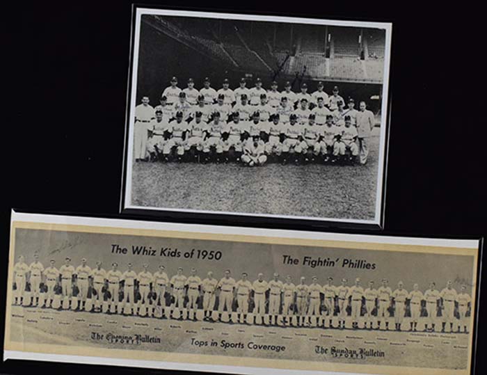 Description:Lot of (2) 1950 Philadelphia Phillies multi-signed photos including Bulletin panoramic premium (VG/EX-EX). Includes 1950 Philadelphia Bulletin panoramic photo premium of the Whiz Kids signed by (8) including Richie Ashburn, Robin Roberts with "HOF 76" inscription, Andy Seminick with "Whiz Kids" inscription, Curt Simmons, Bubba Church, Maje McDonnell, Bob Miller, and Paul Stuffel; and 16"x20" framed 1950 Phillies vintage photo signed by (8) including Robin Roberts, Gran Hamner, Andy Seminick, Mike Goliat, Bubba Church, Bob Miller, Putsy Caballero, and Maje McDonnell. Signatures rate 6/7 to 10 (avg 7) out of 10. Due to framing, complete conditions are unknown, but creases are visible: VG/EX-EX overall appearances