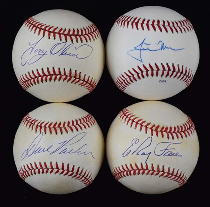 Description:Lot of (10) signed baseballs including some better names (VG/EX-NM). Includes B.Brown AL ball signed by Tony Oliva; International League ball signed by Johnny Podres; W.White NL ball (toning) signed by Elroy Fave; W.White NL ball (toning) signed by Dave Parker; International League ball signed by Justin Morneau; International League ball (used) signed by Victor Martinez; International League ball (used) signed by Sandy Alomar Jr; International League ball signed by Jed Lowrie; International League ball signed by Typer Clippard; and International League ball signed by Carl Pavano. Signatures rate 3/4 (Podres, Alomar) to 9/10 (avg 8) out of 10: VG/EX-NM