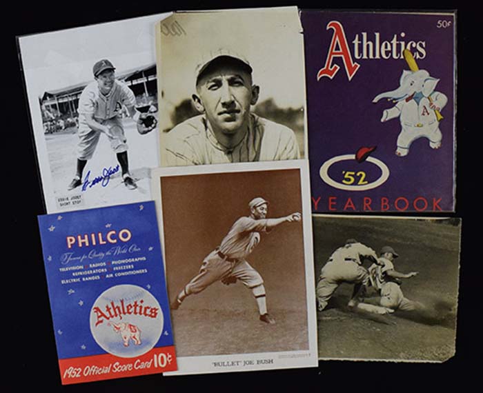 Description:Philadelphia Athletics vintage memorabilia lot (VG-NM). Includes "Bullet" Joe Bush 1913 Baseball Magazine premium (EX/MT, possible edge trimming); 8"x10" c.1916 Elmer Myers press photo (VG); 5"x7" c.1930 Roy Mahaffey press photo (EX); 8"x10" c.1933 Ed Madjeski press photo (VG/EX); c.1940s 4" A's mini pennant (VG/EX-EX); 1941 Double Play #47-48 Hayes/Brancato baseball card (EX); 6.5"x8.5" c.1945 Jesse Flores press photo (EX); 1952 Athletics plastic baseball emblem with original backing (NM); 1952 Athletics yearbook (EX/MT); Aug 15th 1952 Washington Senators at Athletics program (EX/MT-NM, scored in pencil); and 8"x10" photo signed by Eddie Joost in blue marker rating 9/10 out of 10: VG-NM