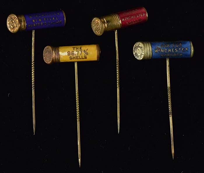 Description:Lot of (4) c.1900s-20s Winchester advertising stick pins done in enameled shotgun shell form (EX-EX/MT) Nice group of similar pins each done in the form of a shotgun shell with colored enamelwork background. Slogans read "Ask For Winchester Nublack", "The 96.77% Shells", "Winchester New Rival Hunter's Choice", and "Shoot Winchester Shells." Touch of light to moderate wear and natural ageing: EX-EX/MT