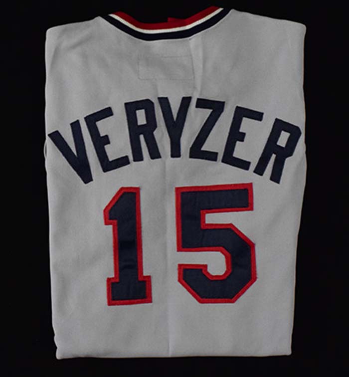 Description:1981 Tom Veryzer professional model Cleveland Indians jersey (EX/MT). Rawlings size 40 jersey with "CLEVELAND" sewn across the front, along with "VERYZER" and number "15" sewn on the back. Indians logo patch is sewn on the left sleeve, and Rawlings tagging is sewn inside the collar with "SET 1 1981" flag tag. Displays light overall use/wash wear: EX/MT