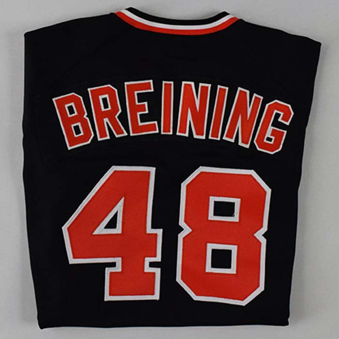 Description:1982 Fred Breining professional model San Francisco Giants jersey with 25th Year patch (EX/MT). Wilson size 44 jersey with "Giants" and number "48" sewn on the front, along with "BREINING" nameplate and number "48" sewn on the back. Giants 25th Year patch is sewn on the left sleeve, Wilson tag is sewn inside the collar, and "48 82" number/year tag is sewn on the front tail. Displays light overall use/wash wear: EX/MT