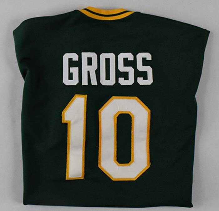Description:1983 Wayne Gross professional model Oakland A's jersey (EX). Rawlings size 46 jersey with "OAKLAND" sewm across the front, along with "GROSS" and number "10" sewn on the back. Rawlings tagging is sewn inside the tail (stitching worn away), with "SET 1 1983" flag tag still attached. Other than the stitching wear around the Rawlings tag, the jersey shows only light use/wash wear: EX