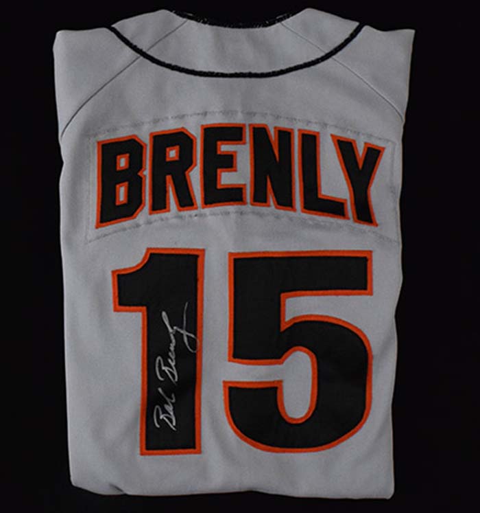 Description:1986 Bob Brenly signed San Francisco Giants professional model jersey (EX). Wilson size 42 jersey with "SF" logo sewn on the front, along with "BRENLY" nameplate and number "15" sewn on the back. Wilson tagging is sewn on the front tail with size "42" flag tag, and "15 86" number/year tag is sewn below. Brenly signed the jersey in silver marker. Signature rates 8/9 out of 10. Displays visible wear, with staining around the collar, and what appears to be an eyeblack stain on the right sleeve: EX