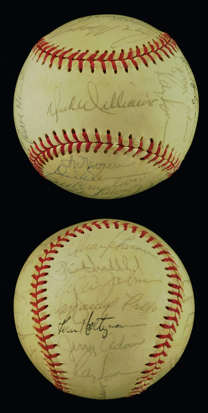 Description:1973 Oakland Athletics team signed baseball (World Series Champions) (EX/MT) Reach J.Cronin Official American League baseball has been signed by (29) incl. Reggie Jackson, Catfish Hunter, Dick Williams, Rollie Fingers, Bert Campaneris, and others. Ink signatures rate an average 7 out of 10. Ball displays some light toning with well defined stampings. Uncommon and desirable Championship team ball. Includes letter of provenance from the Carneal Family: Overall EX ($750-$1,000)