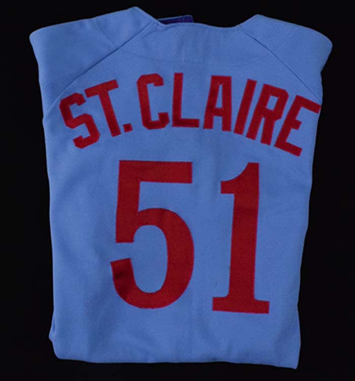 Description:1987 Randy St.Claire professional model Montreal expos jersey (EX/MT). Rawlings size 44 jersey with Expos logo patch, "expos", and number "51" sewn on the front. "ST. CLAIRE" and number "51" are sewn on the back. Rawlings tagging is sewn inside the collar, along with "44 87" size/year tag. Displays light overall use/wash wear: EX/MT