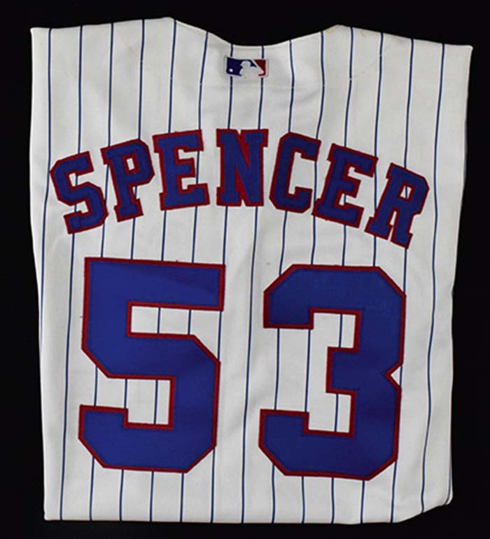 Description:2000 Sean Spencer professional model Montreal Expos jersey with Maurice Richard memorial patch (EX). Russell Athletic MLB Authentic Diamond Collection size 46 jersey with "Expos" and number "53" sewn on the front, along with "SPENCER" and number "53" sewn on the back. "9" Maurice Richard memorial patch is sewn on the right sleeve, and Expos logo patch is sewn on the left sleeve. Russell Athletic tagging is sewn on the front tail, with "100% Polyester" flag tag. Displays visible use/wash wear with staining on the right shoulder: EX